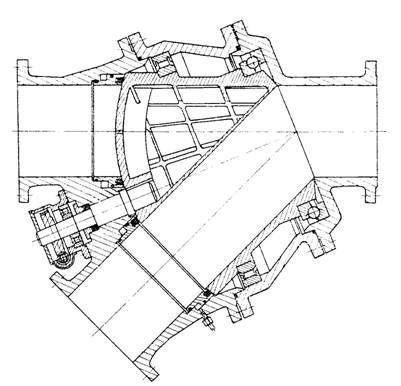 图2-19所示的V形球阀,球体结构虽属半球体球阀,但其设计构思和用途却不同。V形球阀主要用于输送纤维和纸浆等介质。球体上的V形缺口能起切断机作用,以避免纤维物料粘在球体、阀体和阀座之间。此外,V形球阀还广泛用来调节流体流量(见后)。